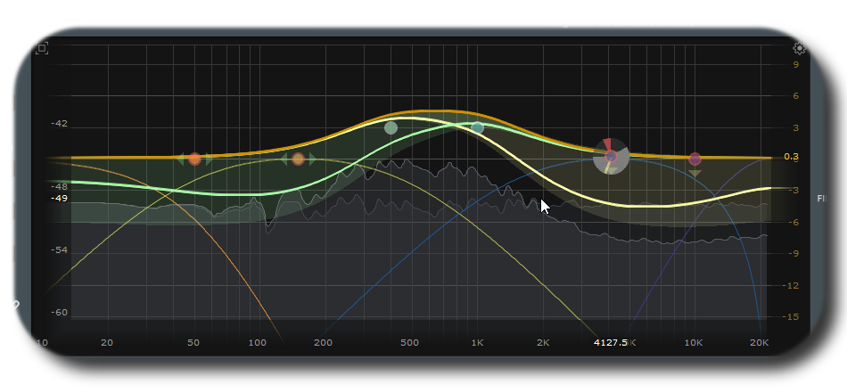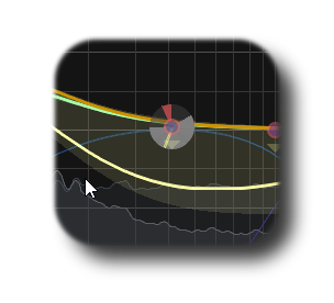 The display shows the spectrum curve of the incoming and outgoing signal. It is controlled by the analyzer modes and settings. The static minimum/maximum filter response is displayed as a light yellow band, Each filter band has its own handle, which can be moved and tweaked by mouse.