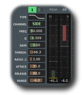 dEQ6 controls the filter gain of each band by a compressor/expander. This reduces or increases the gain in a specific frequency range, depending on the program material. The detector signal for the compressor/expander is processed by a pre filter which is controlled by the centre frequency and Q-factor of the dynamic filter. This ensures that the compressor/expander is only activated by content in the specified frequency range.