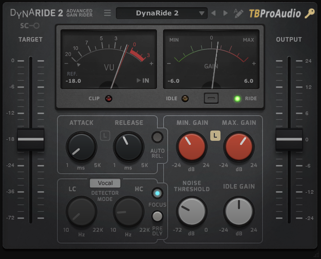 DynaRide offers several detector modes designed for special tasks like dialog, vocal or bass riding. Additionally the riding process can be enhanced by focusing to specific audio signals like speech, vocal and bass.