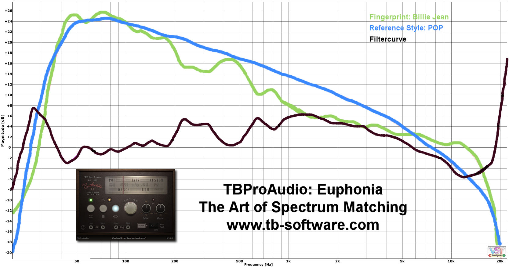 Euphonia compares the spectral fingerprint against build-in curves (Pop/Rock/Dance/Jazz/EDM) and calculates filter settings so that the spectrum of the audio follows the selected average spectrum curves.