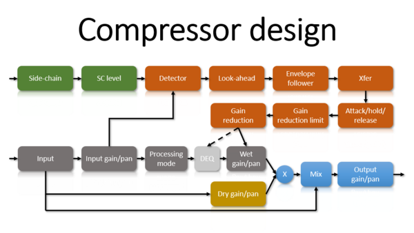 The compressor consists of various modules including detector, transfer curve, danymic EQ and gain staging.