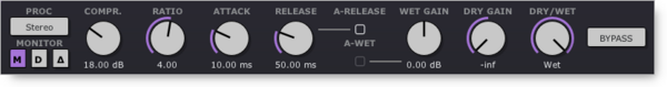 The main control area provides access to the main compressor controls like threshold/compression, ratio, attack and release.