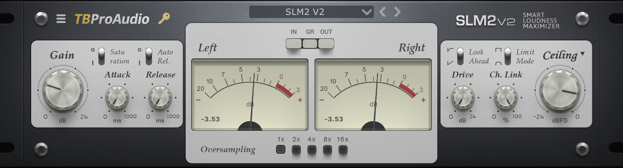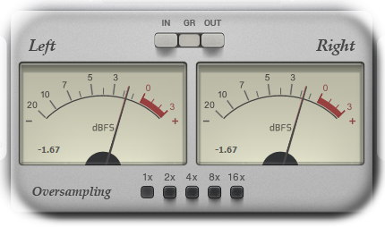 Use the IN / OUT / GR meters to visually control the limiting process. On top of that, SLM2 offers oversampling up to x16.