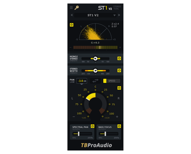 ST1 is a simple tool that lets you control the width and the panorama of a stereo audio signal. It includes a mono-to-stereo function, a stereo field enhancer, a rich panning knob that includes spectral panning, and a bass-focus feature. The phase and correlation meter visually monitors the panning position and stereo width.
