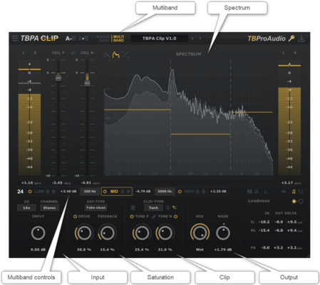 In multiband mode TBPAClip provides 3 bands, each with an individual input, saturation, clip and output stage.