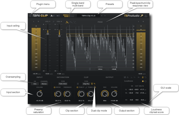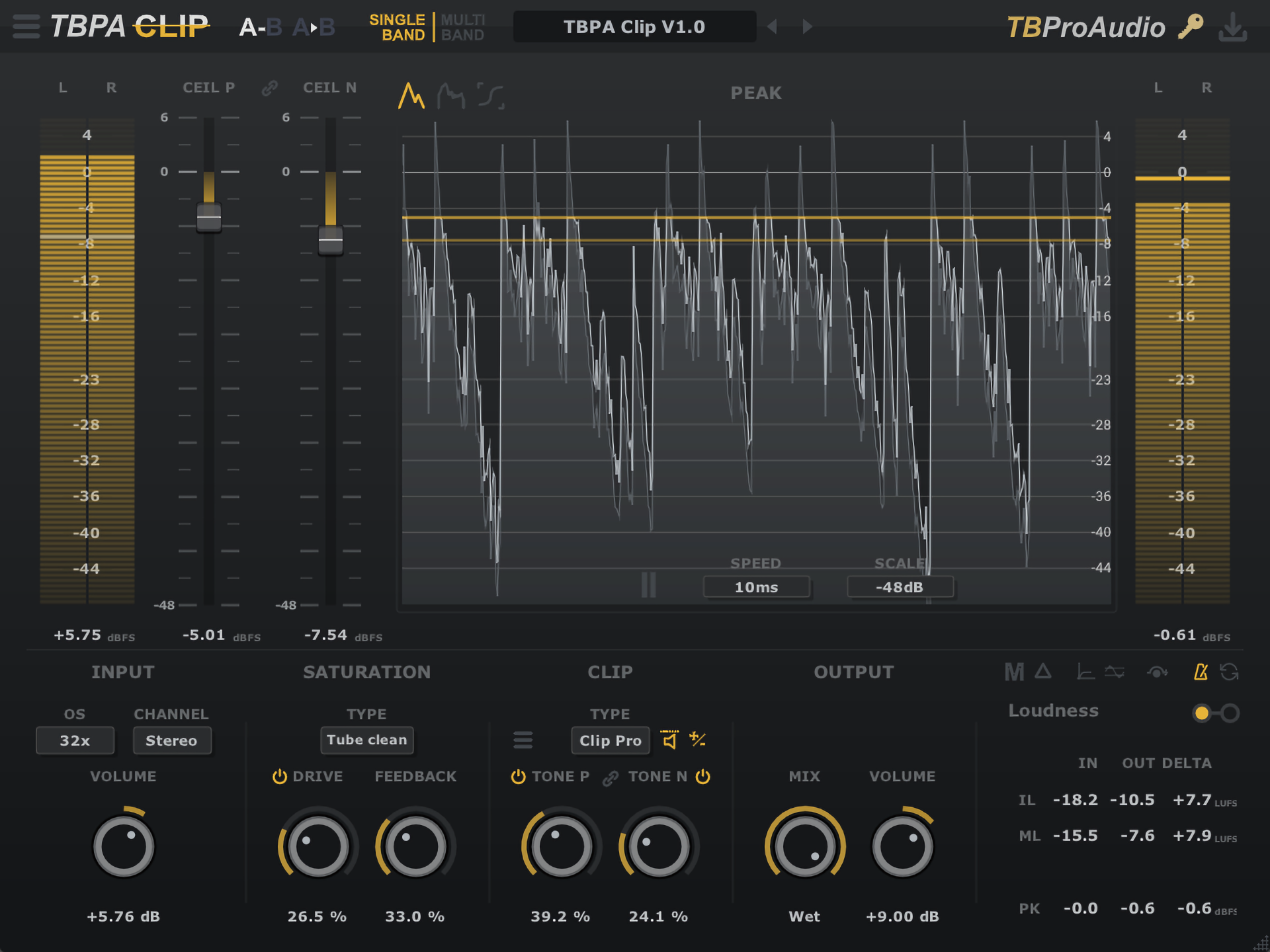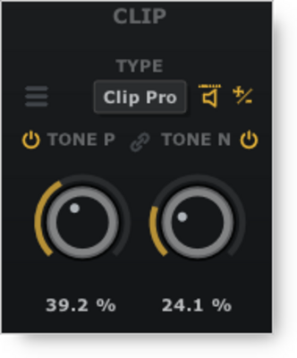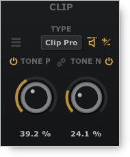 TBPAClip provides independent ceil and tone controls for the positive and negative part of the audio signal (dual clip mode) and various clip types.