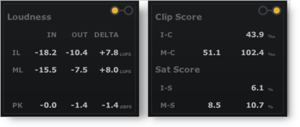 The score page shows the clip and saturation scores. The score values are quantitative measures of the saturation and clipping process and help evaluate the performance of specific tone and drive settings.