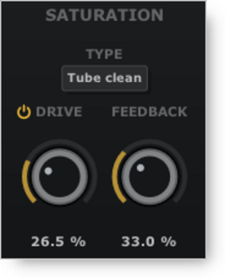 The saturation section controls saturation type, drive and feedback. If the drive control is set to off, the saturation stage is bypassed.