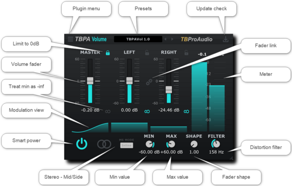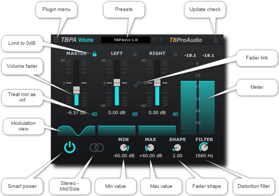 TBPA Volume allows you to control the volume of the audio signal independently from the volume fader of the mix console. This is useful for adjusting the gain/volume between different plug-ins within a plug-in chain or for volume modulation/automation.